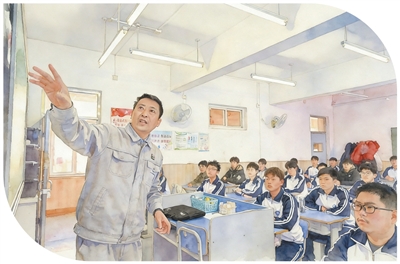 正在天津市汉沽中专,全国代表、中石化第四扶植无限公司工匠学院焊接锻练张振连(左一)为学生们讲课。记者 孙凡越摄。